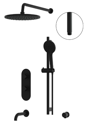 Solid brass round trim set 18″ round shower arm & round flange 4″ round shower arm included for ceiling installation 12” round ABS rainhead Push-button 3-function handshower (rain, mist, jet) with 28″ overall shower rail Adjustable round waterway Round tub spout without diverter Thermostatic valve T12123 sold separately