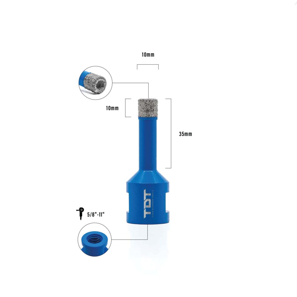 Titan Diamond Tools core bits are available in sizes from 3/16 inches (5mm) to 6-1/4 inches (158mm), offering the widest selection of diameters to choose from. The 5/8″-11 shank is designed to fit all North American grinders and provides maximum cutting power for precise drilling, allowing for fast and efficient results. The diamond segments are built to be durable and reliable, making these some of the most durable diamond core bits on the market. They are capable of drilling through tough materials like porcelain, ceramic, marble, and natural stone with ease.