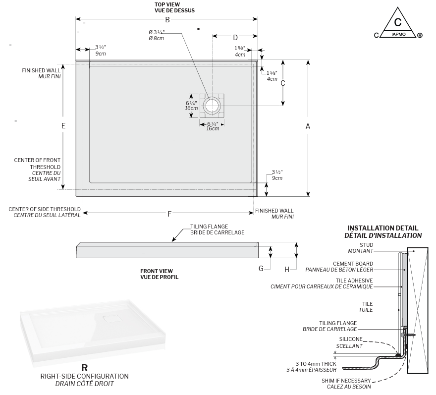 FLEURCO 48X36 ADTC Base With concealed corner drain 12X12 RIGHT SIDE & integrated tile flanges