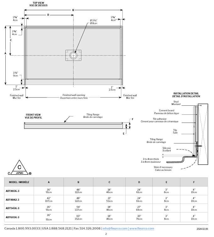 FLEURCO 54×36 ADT ALCOVE Base with concealed center drain & 3 integrated tile flanges
