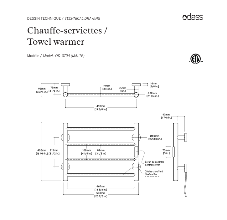 - The bars surface temperature of the towel warmer can be changed thanks to a probe. The minimal temperature is 30 °C and the temperature increase of 5 °C to reach a maximum of 60 °C allowed by the ETL certfication (86 to 140 °F).