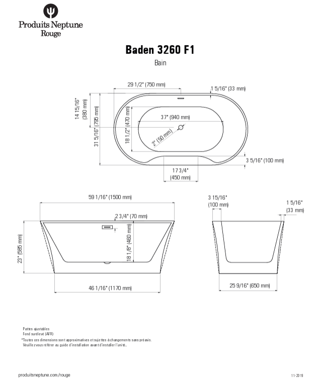 NEPTUNE Baden 3260 AFR Acrylic Freestanding Center Drain Bathtub in White