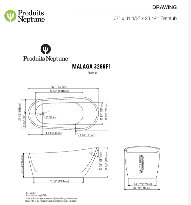 NEPTUNE Malaga F1 3266 AFR Acrylic Freestanding End Drain Bathtub in White
