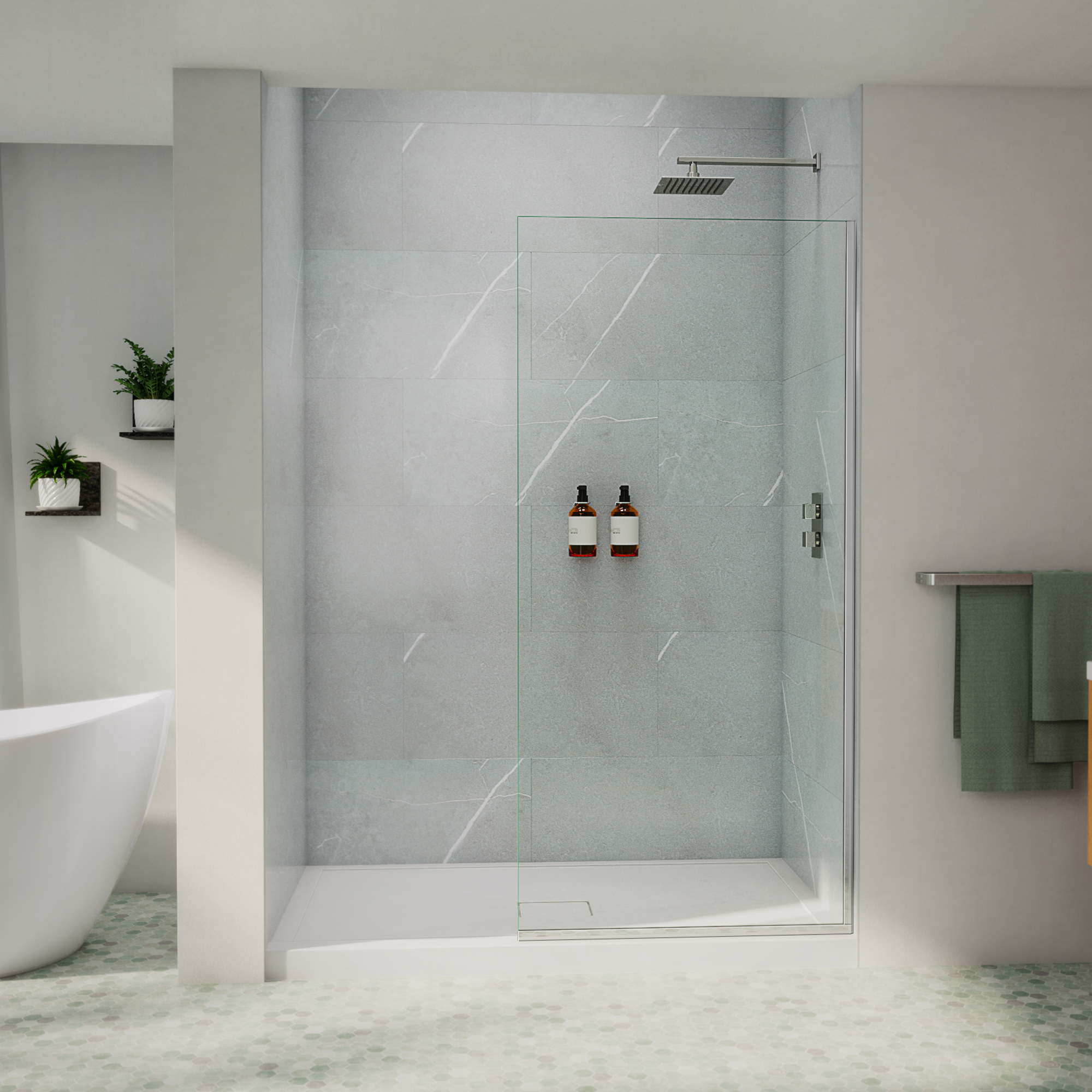 - Open-entry, doorless style in a frameless walk-in shower design