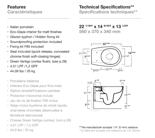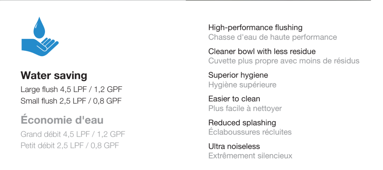- GPF: 1.6 Full flush, 0.8 Eco-flush;