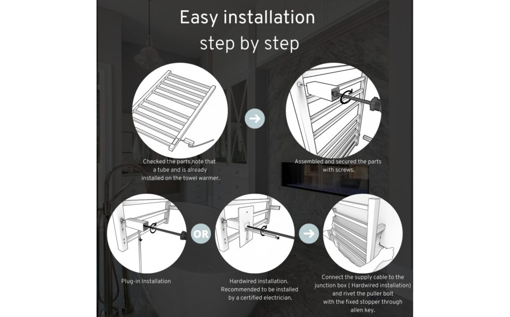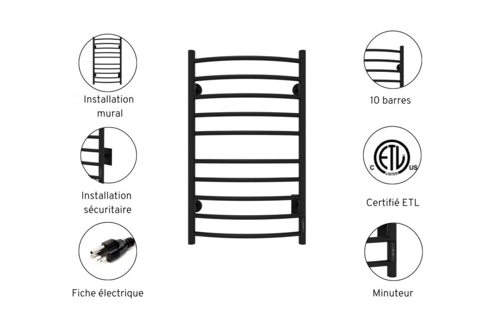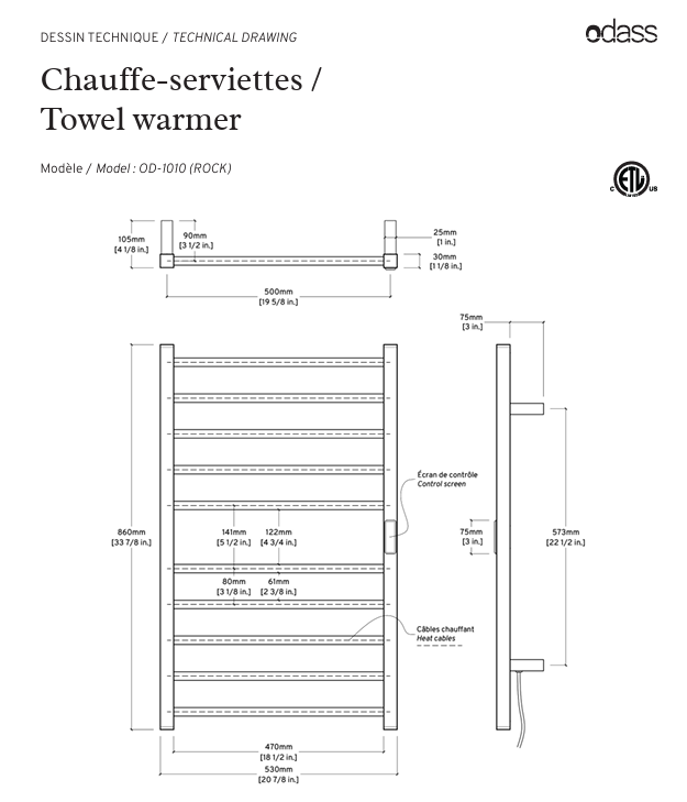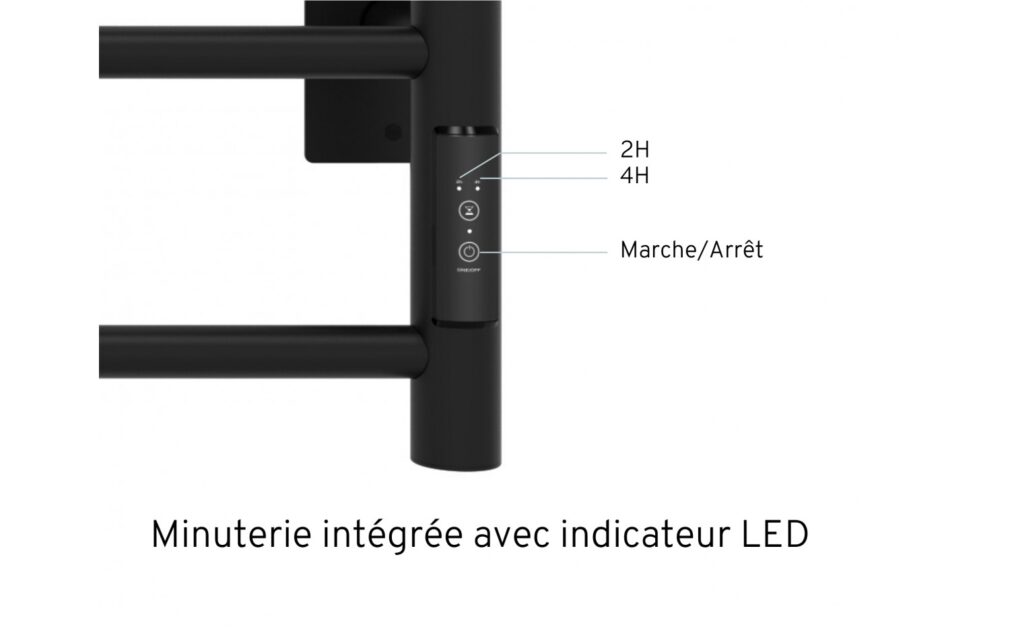 • The bars surface temperature of the towel warmer can be changed thanks to a probe. The minimal temperature is 30 °C and the temperature increase of 5 °C to reach a maximum of 60 °C allowed by the ETL certification (86 to 140 °F).