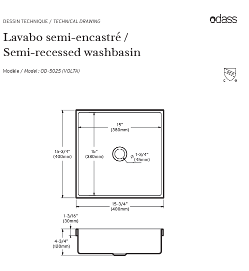 15 3/4″ (400 mm) x 15 3/4″ (400 mm) x 4 3/4″ (120 mm)