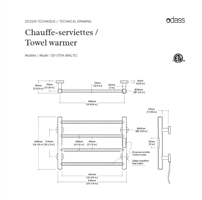 - The bars surface temperature of the towel warmer can be changed thanks to a probe. The minimal temperature is 30 °C and the temperature increase of 5 °C to reach a maximum of 60 °C allowed by the ETL certification (86 to 140 °F).