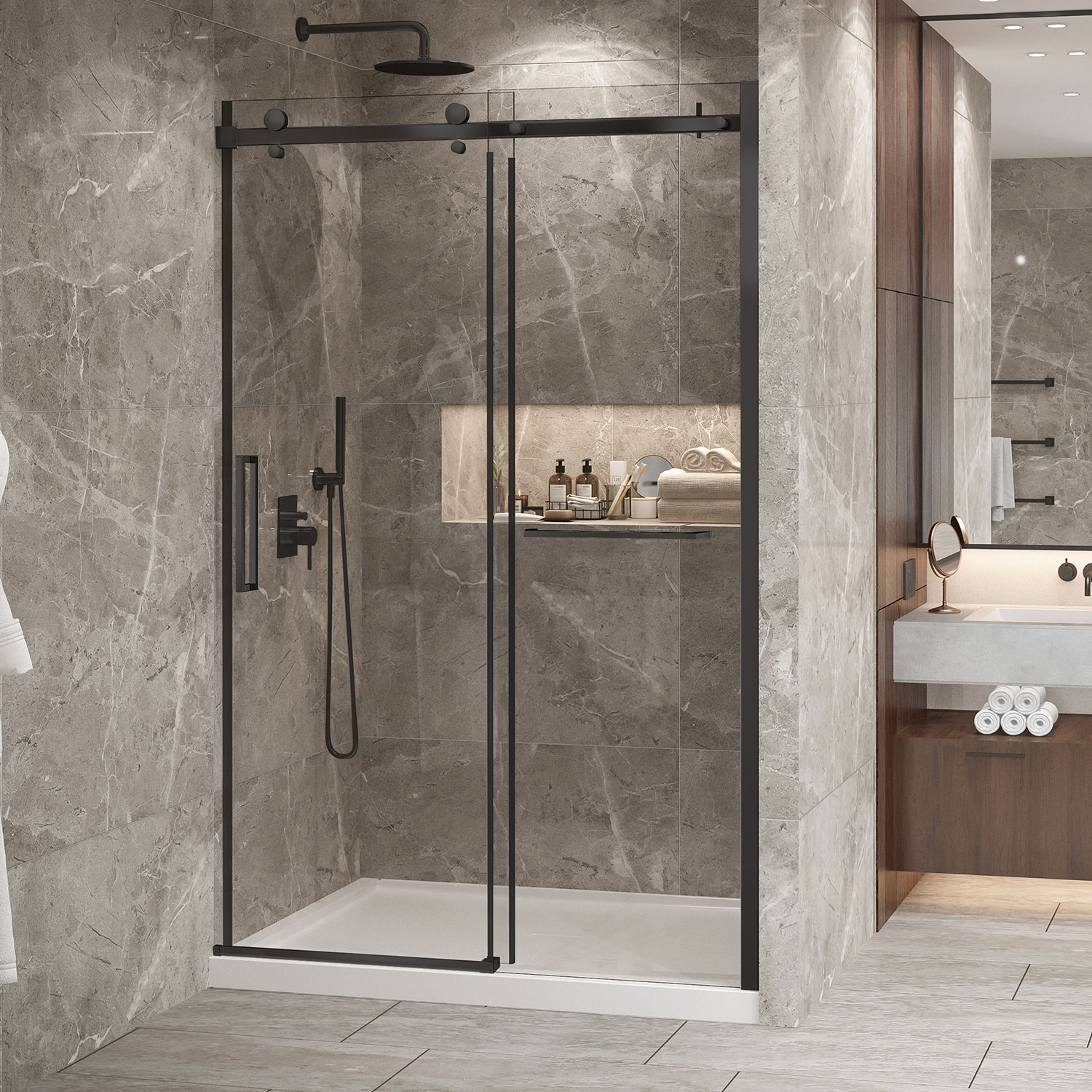 Shower door Bellini 2.0 in alcove, 54″, towel bar inlcuded, sliding door, matte black frame and clear glass, Zitta collection