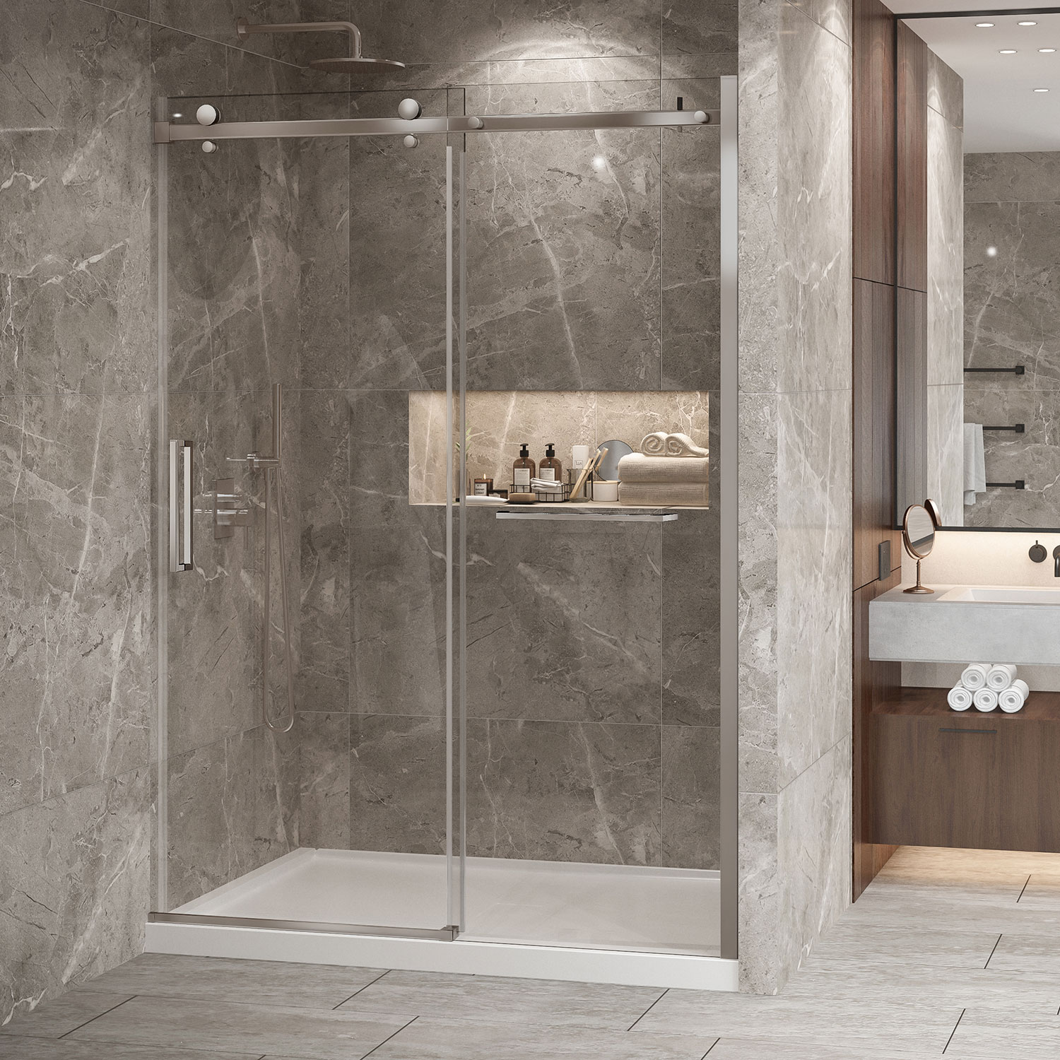 Shower door Bellini 2.0 in alcove, 60″, towel bar included, sliding door, brushed nickel frame and clear glass, Zitta collection