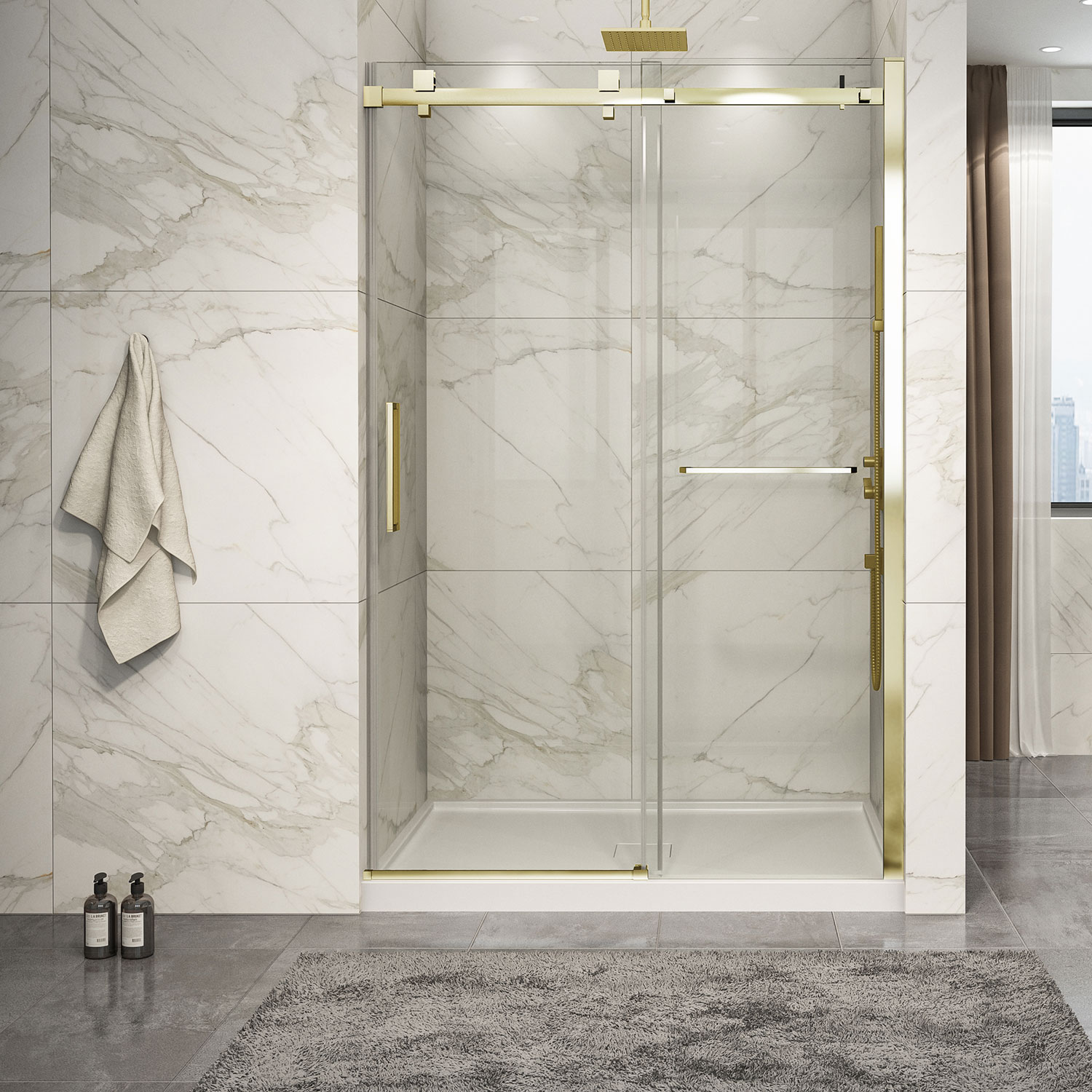 Zitta Piazza 2.0 Shower door 54″, in alcove, in brushed gold