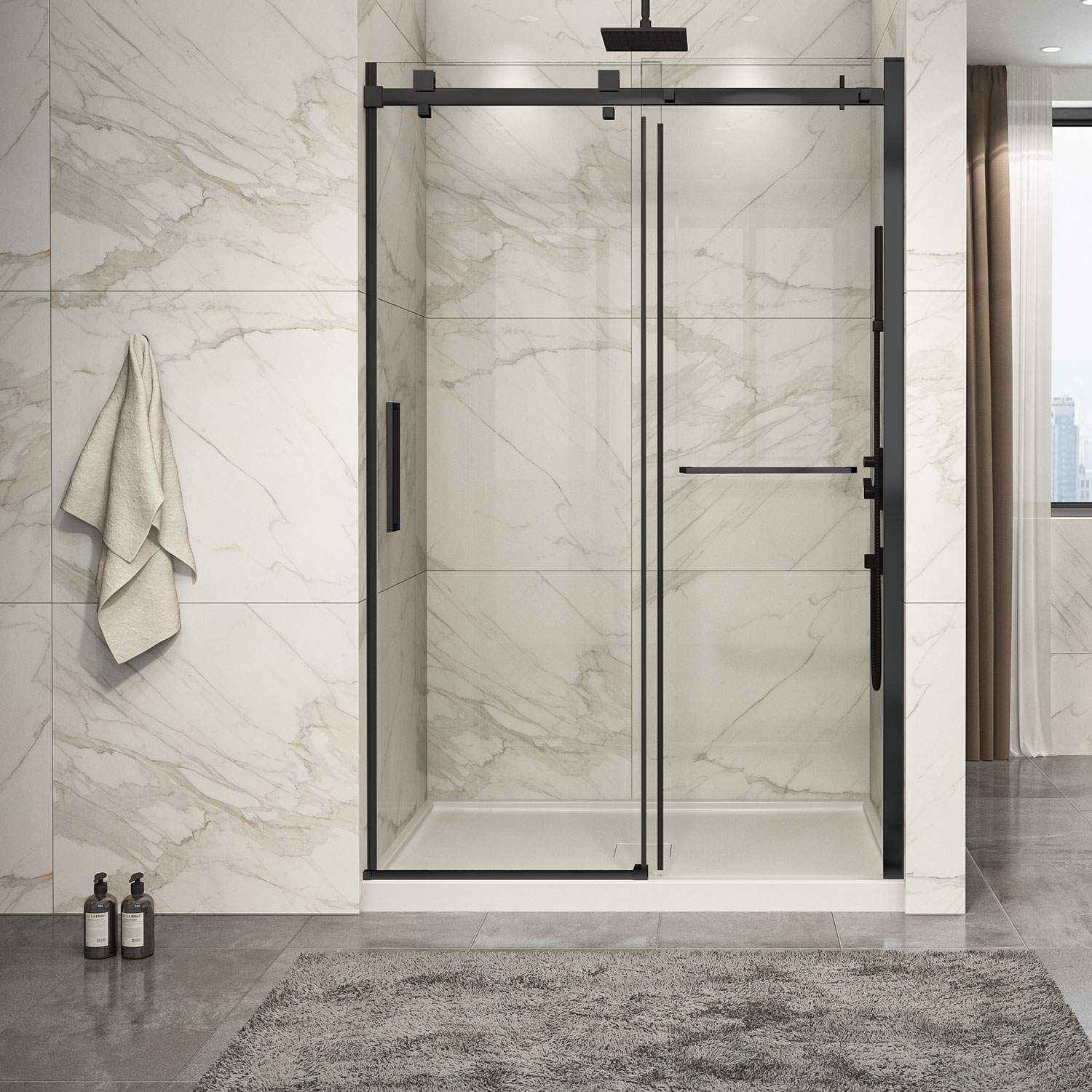 Shower door Piazza 2.0 in alcove, 54″, towel bar inlcuded, sliding door, matte black frame and clear glass, Zitta collection