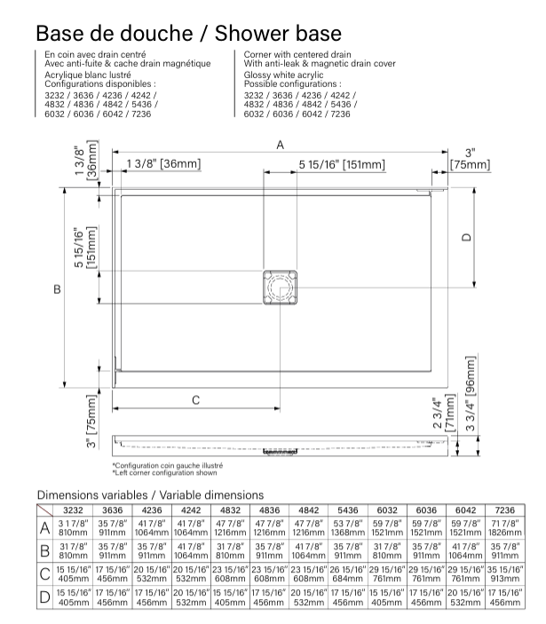 ZITTA Shower base 48″ x 32″, in a corner, wall on the left side, in glossy white with Magnetic cover cap tray