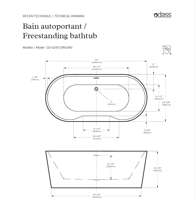 Bain : 63″ (160cm) x 29 3/8″ (74.6cm) x 22 7/8″ (58.1cm)