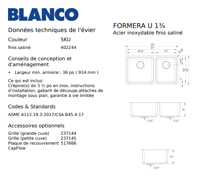 - Largeur min. de l’armoire 36 po