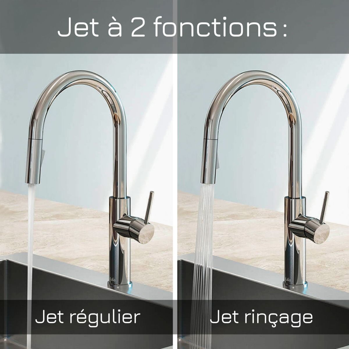 - Douchette extensible ergonomique avec bouton à bascule, à 2 fonctions: jet régulier et jet rinçage