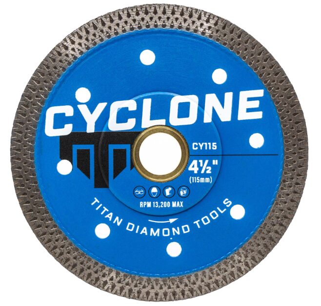 Le disque de coupe diamanté « Cyclone » Turbo de 4-1/2 po (115 mm) est une lame diamantée hautement fiable qui offre des performances optimales et une durabilité à long terme. Cette lame diamantée est dotée d’une technologie de jante en maille diamantée qui garantit une efficacité thermique maximale tout en offrant des coupes extrêmement nettes. Ce disque de coupe est parfait pour les matériaux durs tels que le marbre, le granit, les carreaux de porcelaine, la céramique et autres pierres naturelles. Grâce à son noyau renforcé et à sa rigidité accrue, ce produit offre des performances inégalées dans les tâches les plus difficiles. Notre disque diamanté le plus populaire offre un équilibre parfait entre puissance, polyvalence et durabilité.