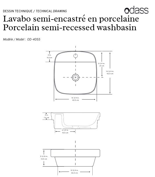 - Lavabo semi-encastré en porcelaine de haute qualité