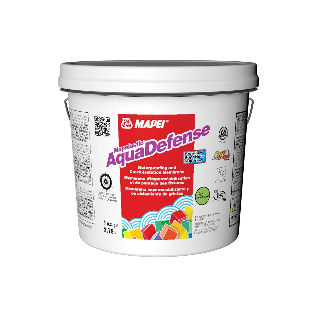 Mapelastic AquaDefense est une membrane d’imperméabilisation et de pontage de fissures prémélangée à base de caoutchouc liquide et à séchage extrêmement rapide, pour installation sous les carreaux de céramique ou la pierre dans les endroits résidentiels, commerciaux et industriels. Mapelastic AquaDefense procure une barrière mince et continue afin de protéger les pièces adjacentes ainsi que les pièces au-dessous des dégâts provoqués par l’eau. Pour une protection supplémentaire dans les endroits problématiques tels que les plinthes, les coins, les fissures et les drains, elle peut être combinée au tissu de  enforcement Reinforcing Fabric ou aux accessoires Mapeband MC MAPEI (bande en rouleau pour plinthes et bande d’étanchéité carrée pour renvois). Mapelastic AquaDefense sèche en 30 à 50 minutes, puis