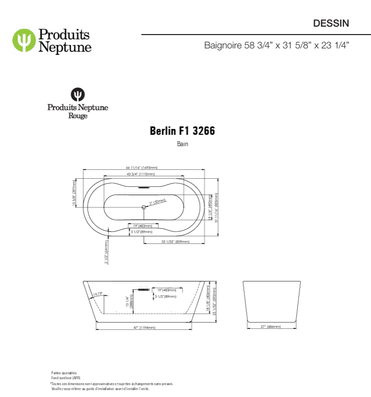 - Fond surélevé (AFR) permettant aux tuyaux d’être acheminés sans percer le sol ni déplacer le drain