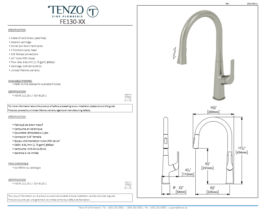 - Débit: 6.6L/min [1.75 gpm] @60psi