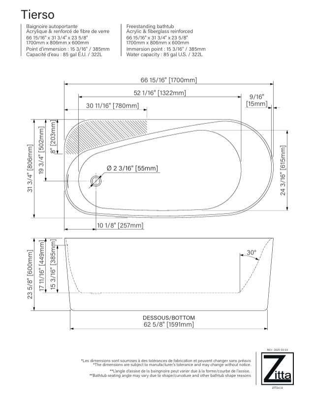 ZITTA TIERSO 67 Baignoire autoportante 66 15/16″ x 31 3/4″ x 23 5/8″ blanc lustré