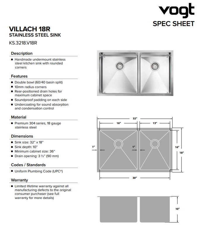 VOGT VILLACH 18R – 32″x18″x10″ AVEC CRÉPINES ET GRILLES DE FOND ACIER INOXYDABLE