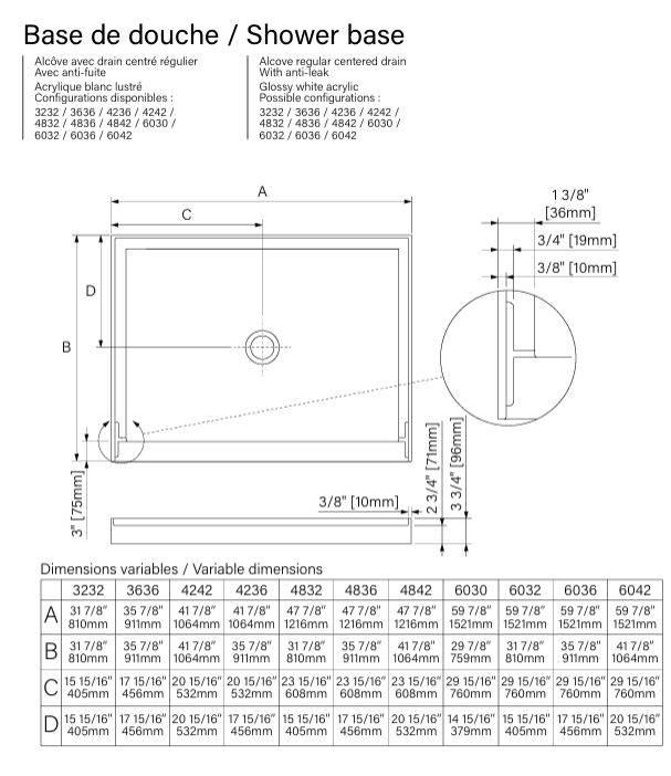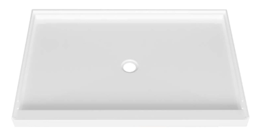 Base de douche 48 x 32, en blanc lustré, en acrylique, en alcôve, drain régulier central, collection Zitta